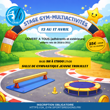 Le club ouvre ses portes, du lundi 13 au vendredi 17avril 2026, pour un stage plein d'énergie, de gym et de découvertes pour les enfants adhérents au club nés entre 2019 et 2013. La demande d'inscription se fait à la journée via le formulaire ci-de...