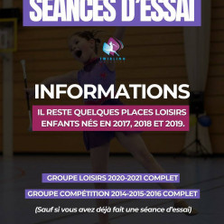 Publié le 22 août 2025📣 INFORMATIONS DERNIÈRE SÉANCE D’ESSAI Il reste quelques places dans le groupe loisirs du mercredi 15h30‑17h30 pour les enfants n...