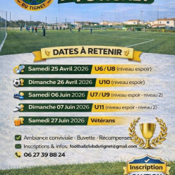⚽ Ouverture des Tournois du FC Tignet : Honneur aux U6 & U8 ! Le coup d'envoi de notre saison des tournois est lancé ! Le FC Tignet est ravi d'ouvrir le bal le samedi 25 avril 2026 en accueillant les jeunes pousses du football pour une journée mémor...