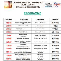 Course N°1 , 9h30: – 2400 m minimes F (2010-2011) et benjamins (2012-2013) Course N°2 , 9h50: -3200 m minimes G 2010-2011) et cadettes (2008-2009) Course N°3 , 10h10: – 4000 m cross court homme & fille (2007 et avant) & cadets (2008-2009) Course N...