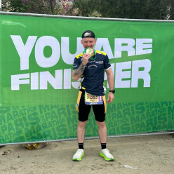 Florent ROCHETEAU courrait son premier Marathon ce diamnce sur le bitume Parisien. Il le termine presque facilement, en tout cas...