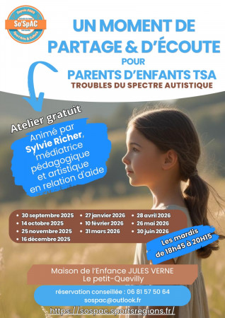 L'un de nos temps forts réguliers et ouvert à toutes et tous, y compris si vous n'êtes pas adhérent à So'SpAC. Retrouvez notre intervenante spécialisée Sylvie pour un moment de partage et d'écoute autour des TSA (troubles du spectre autistique) C'e...