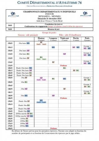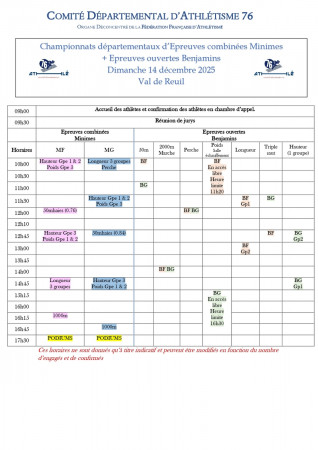 Il s'agit pour les benjamins des championnats d'épreuves combinées avec l'obligation de participer aux 4 épreuves : Benjamines : Hauteur, poids, 50m haies, 1000m Benjamins : Longueur ou perche, poids, 50m haies et 1000m Pour les minimes, ce son...