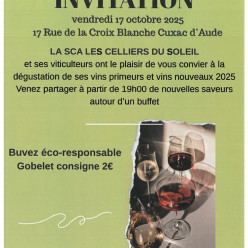 Vins primeurs et vins nouveaux : Comme il en est de coutume, Les Celliers du Soleil vous invitent pour une dégustation des vins nouveaux autour d'un buffet le vendredi 17 octobre à partir de 19h. Rendez-vous sur le parvis de la Cave Coopérative. L...