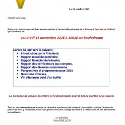 Publié le 11 octobre 2025CONVOCATION ASSEMBLÉE GÉNÉRALE DU 14 NOVEMBRE 2025 AU BOULODROME