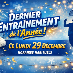 En raison des fêtes de fin d’année, il n’y aura pas d’entraînement de badminton le jeudi 25 décembre. Nous vous souhaitons à tout...