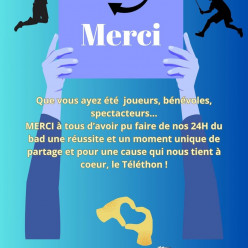 Nous tenions à vous remercier pour votre participation aux «24h du Bad», organisé par notre club du samedi 29 novembre 9h au diman...