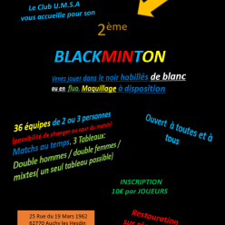 Bonjour Pour sa deuxième édition le club U.M.S.A de Auchy les Hesdin organise un Blackminton le Samedi 29 Novembre à partir de 19h00. Inscription par Mail et nous vous renvoyons le tableau de restauration. Ci-joint le Flyer Merci
