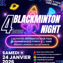 Bonjour à toutes et tous, Le SAVONNIERES BADMINTON CLUB vous invite à participer à la 4ème édition de son BLACKMINTON NIGHT, le samedi 24 janvier 2026 de 18h à minuit. AU PROGRAMME 3 ACTIVITÉS POSSIBLES : BLACKMINTON : VENEZ JOUER AU BA...