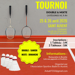 Bonjour, Le club Badm'in Auvent (ASBA) est très heureux de vous convier à participer à leur tournoi annuel senior qui aura lie...