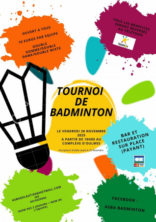 Tournoi de badminton au complexe d'Oulmes (situé ici) le vendredi 28 novembre 2025 à partir de 19H00.
