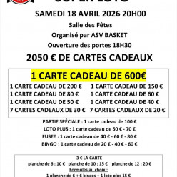 🏀 Loto du club de basket de Vernoil 🏀 Le club de basket de Vernoil organise son grand loto le samedi 18 avril à 20h ! 🎁 2050 € d...