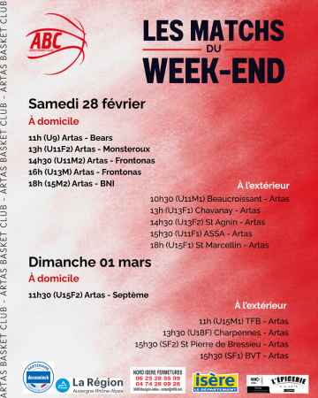 Les matchs du week-end du 31 janvier & 01 février En raison de l'indisponibilité du gymnase d'Artas samedi toute la journ...