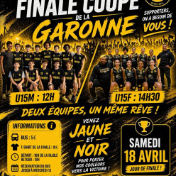 FINALE COUPE DE LA GARONNE Samedi 18 avril U15M : 12h U15F : 14h30 Tous en JAUNE & NOIR ! Venez faire du bruit et pouss...