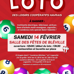 Grand Loto des Loisirs Coopératifs Havrais Samedi 14/02, Salle des Fêtes de Bléville Ouverture des portes : 12h00 Début des tirages : 13h30 Espace restauration et buvette sur place Renseignements et réservations : 06.63.57.80.51 (appel ou SMS, d...