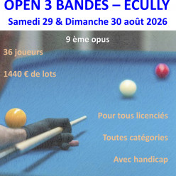 bonjour à tous et toutes L'ABOL Ecully est heureuse de vous convier à notre 9ème opus OPEN 3 BANDES du samedi 29 et dimanche 30 août Vous trouverez ci-dessous le réglement et l'affiche associée Pour vous inscrire, il peut suffire de m'envoyer un m...