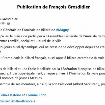 L’Amicale de Billard de Magny, qui dispose d’une salle de deux tables de carambole de 2,80m, vient de mettre en service un 3° bill...