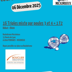 Coupe MMA BOUCLIER 16 Triples Mixtes 3 et 4 + 1 F2 autorisé : par poules Début : 8hRepas possible au Boulodrome Viens passer un super moment de Sport Boules