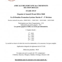 TIRAGE clic ici L’éliminatoire Simple 3° division du District se déroulera le 19 avril prochain, à Belfort au stade SNCF. A cette occasion, l’Amicale Belfortain des Cheminots propose aux participants le repas suivant, mais uniquement sur réservatio...