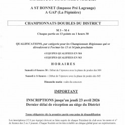 Le championnats de double du District débutera le : SAMEDI 2 MAI 2026 à ST BONNET et GAP (M4 le matin 8H30, M3 l’après-midi 1...