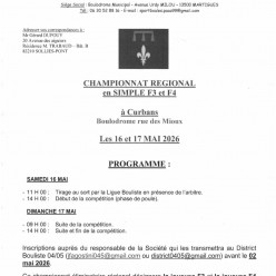 Les championnats régionaux de simple des catégories F3 – F4 se dérouleront à Curbans (04) samedi 16 et dimanche 17 mai au boulodro...
