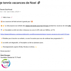 🎄Le club organise sa fête de Noël le samedi matin 20 décembre🎄: 🎉 Au programme: 👉 Sur les courts 1 et 2 (pour les 10-15 a...
