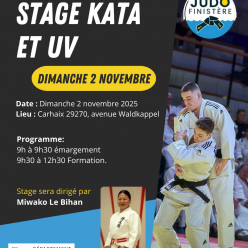 Bonjour, Nous avons le plaisir de vous inviter au stage Kata et UV, destiné aux cadets à seniors, qui se déroulera le dimanche 2 novembre 2025 à Carhaix, avenue Waldkappel. Le stage sera dirigé par Miwako Le Bihan. Programme : 9h00 – 9h30 :...