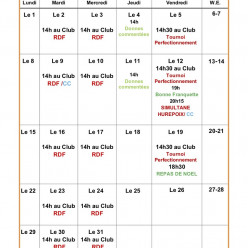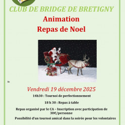 L'animation organisée autour du repas de Noël le 19 décembre 2025 au club prévoit un tournoi de perfectionnement à 14 h 30, suivi du repas à table à 18 h 30, avec la possibilité d'un tournoi amical dans la soirée pour les volontaires. La participatio...