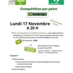 Le Comité de Bridge du Limousin organise un nouveau Challenge par paires sur RealBridge, ouvert à tous les passionnés de la région...