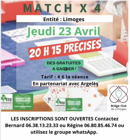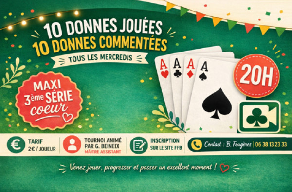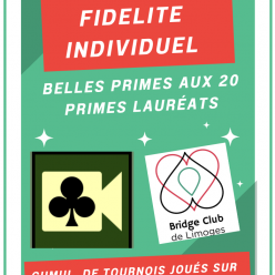 La Compétition en Par 4 à handicap en présentiel du Bridge Club de Limoges. Sur une saison, chaque équipe rencontre chacune des autres équipes en lice. Tous les renseignements sont fournis via le bouton du tableau de commandes "Trophée de Limoges":...