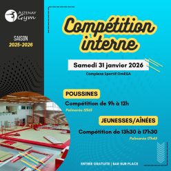 [COMPETITION INTERNE] Samedi 31 janvier Voici le programme : POUSSINES 9h à 12h palmarès à 12h15 JEUNNESSES/AINEES 13h30 à 17h30 palmarès à 17h45 Entrée gratuite - Salle de gym Complexe OmEGA Nombre de places limité : merci de limiter le nom...