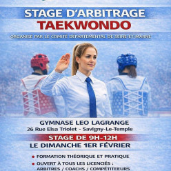 Stage d'arbitrage organisé par le Comité Départemental de Taekwondo de Seine-et-Marne Formation théorique et pratique Ouvert à tous les licenciés arbitres / coachs / compétiteurs Contact : 07 68 77 39 24 / 06 33 37 50 00 Inscripti...