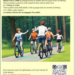 Le club "Cyclo Bernay" est heureux de vous proposer une balade à vélo ouverte à tous autour des environs de Bernay. Le rendez vous est donné ce samedi 7 février 2026 à 14h00 sur le parking devant la Gabelle près de la gare de Bernay. (sauf si météo...