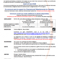 Mandat Inscriptions en ligne UNIQUEMENT , avant le 03 mai 2026 https://lesapachesfm.e-monsite.com/pages/contact-club/inscription-tae.html Renseignements par email: concours.lesapachesfm@outlook.fr ou au 06.83.11.29.57 Championnat Départemental ...