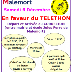 Bonjour à tous, Ce samedi, nous participerons à l’encadrement d’une randonnée au profit du Téléthon. Ce parcours, d’environ 25 km, est destiné aux groupes 1 et 2. Chacun de vous, ainsi que vos amis, peut venir y participer. Pour les plus petits, au...