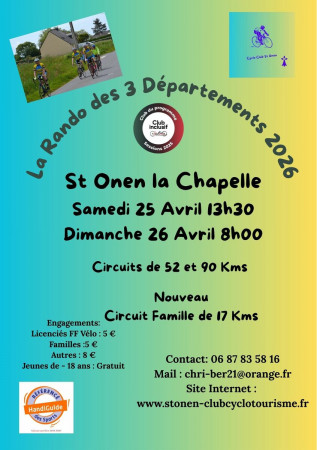 Départ à 13h30 le Samedi et 9h00 le Dimanche devant la mairie. Distance: 60 kms Description du parcours: ST ONEN LA CHAPELLE LE CROUAIS QUEDILLAC ST JOUAN DE L'ISLE RECOUVRANCE BROONS...