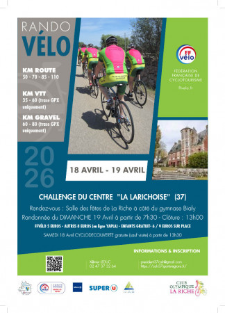 Le Club Olympique La Riche organise cette année 2026 le challenge du Centre . " La Richoise " Cette manifestation aura lieu les 18 & 19 Avril 2026 . Samedi 18 Avril : Cyclo découverte gratuite ( sauf les visites ) à partir de 13 h 30 Dimanch...