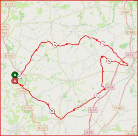 Circuit JE150 – 17924166 A: 63 kms : Beaupréau - Andrezé – A G La Houssière – A D La Chaperonnière - Jallais – A D Bois Bodard – A D Le Vert – A G La Croix Qui Chante – A D Le May – Direction Andreze – A G Direction Bégrolles – A D Abbaye Bellefonta...
