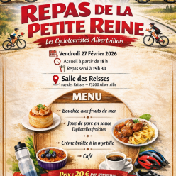 Les Cyclotouristes Albertvillois ont le plaisir de vous inviter au Repas de la Petite Reine. 📅 Vendredi 27 février 2026 🕕 Accueil à partir de 18h00 🍽️ Repas servi à 19h30 🍴 MENU sur l'affiche 💶 Prix : 20 € par personne Ce sera un moment convivial...