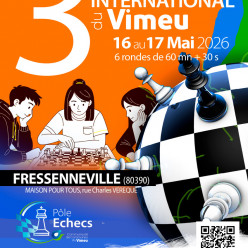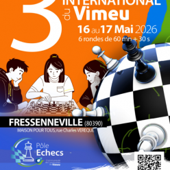 5ème Open cadence lente à Meaux -2400 ELO 3 jours de compétitions Du vendredi 15 mai 2025 au dimanche 17 mai 2025 7 rondes en cadence 60 mns + 0,30s/c Inscription par billetterie web HelloAsso : https://www.helloasso.com/associations/club-d-echecs-l...