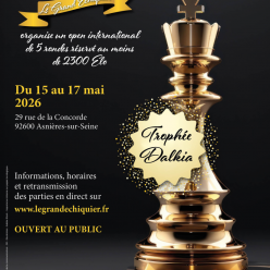 5 rondes - 1h30 + 30 sec/coup - limité à 60 joueurs - réservé aux joueurs dont le classement est inférieur à 2200 pts Elo - Total prix : 70 % des des inscriptions reversées en prix + Trophées et prix spéciaux - 1er prix garanti : 400 € - Inscriptions...