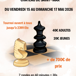 2ème Open de Saint-Max, ouvert à tous jusqu'à 2399 Elo 7 rondes en 60+30 du vendredi 15 mai au dimanche 17 mai (week-end de l'Ascension) Tournoi limité aux 50 premiers inscrits payants ! L'inscription sera validée uniquement à réception du paiement....
