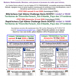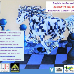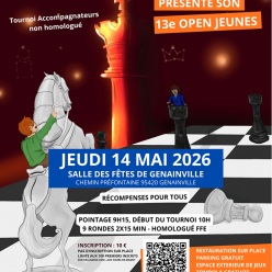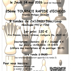 Le tournoi sur le site de la FFE Article 5 : Horaires des rondes Ronde 1 le 16/05/2026 à 9h30 ; ronde 2 = 13h30 ; ronde 3 = 17h Ronde 4 le 17/05/2026 à 8h30 ; ronde 5 = 12h15 ; ronde 6 = 15h30 Buvette & friandises Petite restauration Salle d'an...