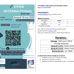 Pointage : entre 9h15 et 9h50 Open A- réservé aux joueurs moins de 2200 Elo Rapide 9 rondes en 12 min + 2 secs/coup de 10h à 18h Inscription : 15€ adultes 10€ jeunes- Majoré à 18€ adultes 13€ jeunes dans la limite des places disponibles Inscription...