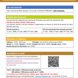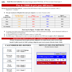 Pointage entre 13h15 et 13h45 le 5 juillet 2026 1er Ronde : le 5 juillet 26 à 14h 2ème Ronde : le 6 juillet 26 à 14h 3ème Ronde : le 7 juillet 26 à 10h 4ème Ronde : le 7 juillet 26 à 15h 5ème Ronde : le 8 juillet 26 à 14h 6ème Ronde : le 9 juillet 2...