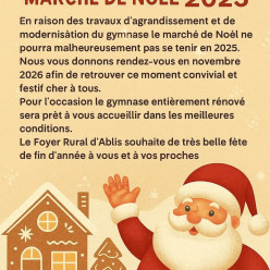 Chers tous, C’est avec un grand regret que nous devons vous informer de l’annulation du marché de Noël 2025. En raison de travau...
