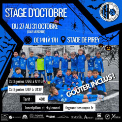 Premier stage de la saison proposé à nos jeunes footballeurs et footballeuses ! Rendez-vous le lundi, mardi, jeudi et vendredi de la deuxième semaine des vacances de la Toussaint sur le synthétique de Pirey, pour quatre après-midis de jeux, d'ateli...