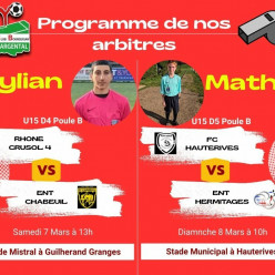 Créez le site de votre clubNos deux jeunes arbitres, ont également un beau programme avec des matchs d'U15 à arbitrer. Bon Match à tous et surtout à Kylian...
