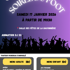 La soirée du foot aura lieu le Samedi 17 janvier 2026 à partir de 19h30 Salle des Fêtes de La Baconnière. Soirée privée Animation: DJ 53 Menu Adulte 18€: Apéro, Pavé de boeuf - suprême de Pintade, Accompagnement, Fromage-Salade, Café gourmand. M...