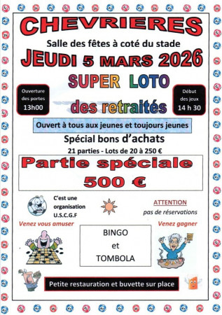 L'USCGF organise son prochain Loto, le jeudi 5 mars 2026, à la salle des fêtes de Chevrières (à côté du stade).